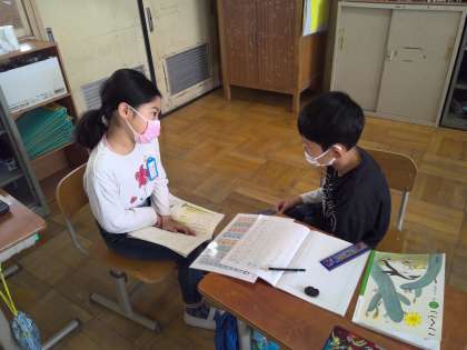 「ふきのとう」の学習では、それぞれの登場人物のセリフをどのように工夫して読むとよく伝わるかを考えています。友だちと話し合うことで様々な意見や考えに触れ、より学びを深めていきたいと思います。