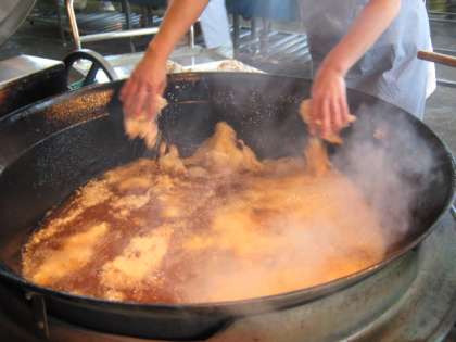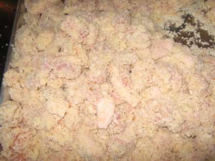 家庭と同じように,鶏肉に塩・こしょうをして,小麦粉と卵をあわせた衣・パン粉をつけて油で揚げます。冷蔵の鶏肉はとても冷たいです。手作りのカツは,衣が薄くとても美味しいです。カリッと揚がったチキンカツに給食室で作ったソースを教室でかけていただきます。