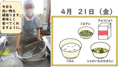 「じゃいものそぼろ煮を食べて、楽しい気持ちになった」「いつもおいしい給食を作ってくれている先生方に「ありがとう」と伝えたい」「ごまや昆布のいい香りがした」と感想を書いてくれました。