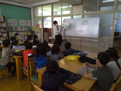 図書の時間に図書館司書の高田先生に「いなばのしろうさぎ」を読み聞かせしてもらいました。内容だけではなく、どこのお話で、場所によって伝わり方が違うことも知ることができて子どもたちも興味津々でした。