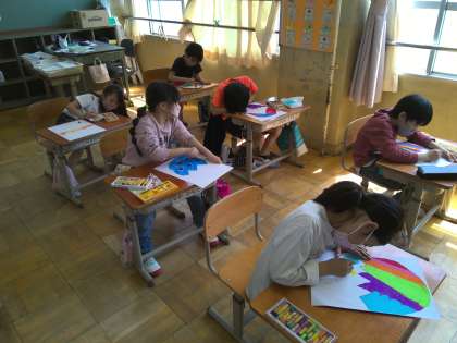 図画工作科「ふしぎなたまご」の学習では、自分の作ったたまごから、様々なものが飛び出してくる絵を想像して書いています。まずは自分だけのオリジナルのたまごを作り、クレパスで丁寧に色を塗りました。たまごの割り方も考えて素敵なたまごがたくさんできました。