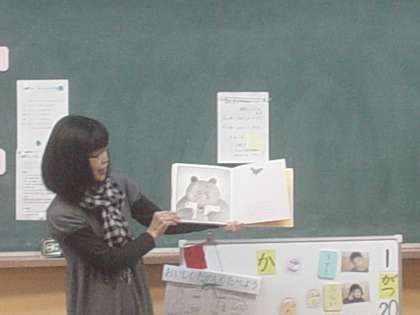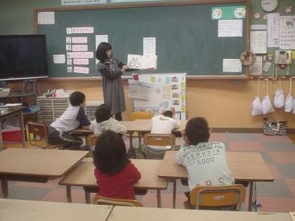 「ありがとう」という絵本で,聞いていて心がやさしくなるような内容でした。子どもたちたちは大変真剣に聞いていました。最後の「ありがとうございました。」もしっかり言えました。