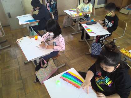 たまごが完成したので、割って自分たちのお気に入りの世界を描いています。たまごの割り方も人それぞれで、楽しんで作品を描くことができました。