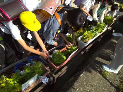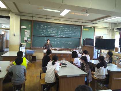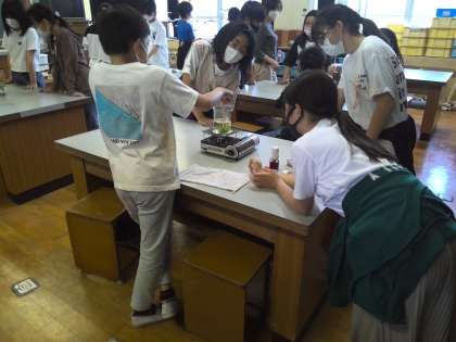 理科の学習で、植物の成長と日光の関わりについて学習しています。植物の葉に日光が当たると葉にデンプンができるのかを調べるため、ジャガイモの葉を使って実験をしました。アルミニウムはくをかぶせて日光に当てた葉と、外して日光に当てた葉の両方を、湯で煮てからヨウ素液に入れて比べました。
