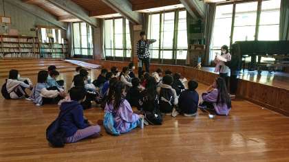 お腹いっぱいお昼ごはんを食べた後はスコアオリエンテーリングに出発します。係の人から頑張りたいことの発表がありました。楽しく出きるようにみんなで協力しましょうというお話もありました。