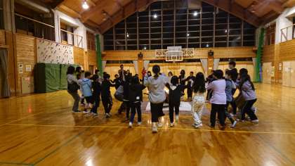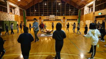 キャンドルファイヤーが始まりました。火の子達が協力、平和、友情の火を神様から受け取り、キャンドルに灯をともしました。