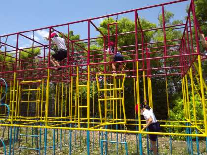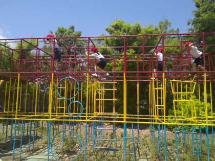 遊具を使うときの遊び方やきまりについて確認しました。総合遊具は、初めて3段目の一番高いところに登り、滑り台を使いました。初めての高さに怖がる児童もいましたが、これから何度も取り組むことで慣れていってほしいと思います。