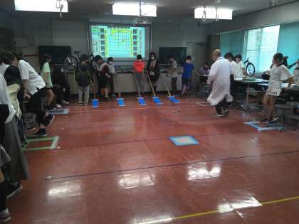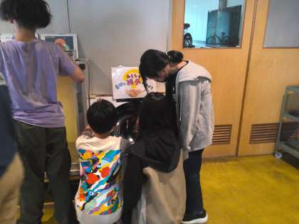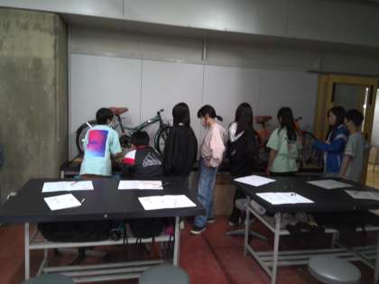 「こいで走って乗らずに発見!自転車の科学」では、自転車に誰もが安全・快適に乗れる秘密について、実験を通して解明しました。休憩時間には、廊下にある展示物を見て楽しみました。