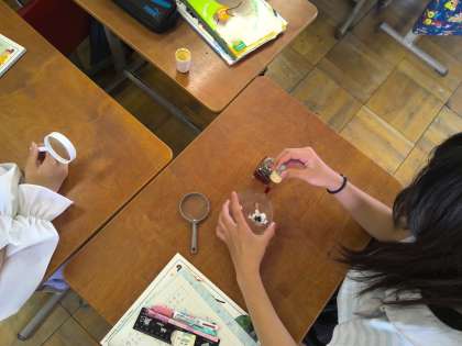 理科の植物の発芽と成長の学習で、インゲンマメを使って植物の発芽の養分がどこから来るのかを調べました。半分に切ったインゲンマメにヨウ素液を使うと、青むらさき色に染まり、養分があることが分かりました。