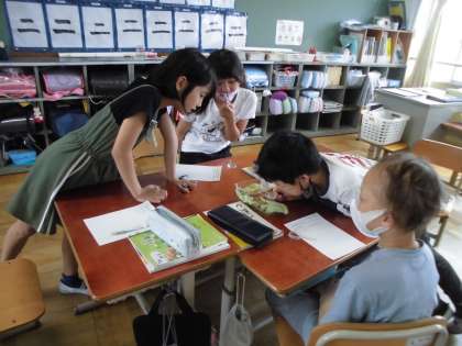 今日は、モンシロチョウの幼虫の様子を観察しました。卵からかえったばかりなのでまだ小さいですが、虫眼鏡をつかって観察しました。