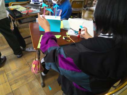 図工では、「くるくるクランク」という学習に取り組んでいます。クランクを回すとかざりが上下するという仕組みを生かして、作品作りをしています。それぞれ楽しい作品を計画していて、完成するのが楽しみです。
