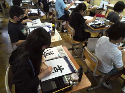 毛筆の学習で「道」を書きました。中と外の文字の組み立てや穂先の動きに気を付けながら、集中して活動を進めました。バランスを整えて書くことができたり、しんにょうの最後の払いがうまくいったりしたことに満足した様子の子ども達でした。