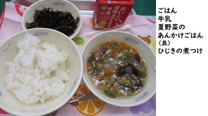 今日の献立は、ごはん・牛乳・夏野菜のあんかけごはん(具)・ひじきの煮つけです。