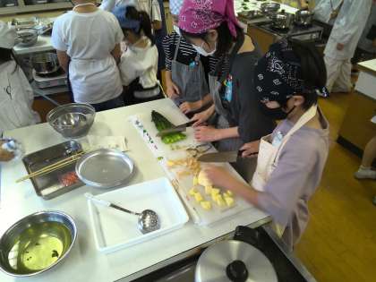 家庭科の学習で、ゆで野菜の調理に取り組みました。今回はじゃがいもとほうれん草です。ジャガイモの皮をむいて食べやすい大きさに切りゆでたり、ほうれん草をゆでて一口サイズに切ったりして盛り付けていきました。初めて包丁や皮むきを使うという人もいましたが、何とか安全に、けがなく調理ができました。