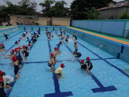 体育科で「みずあそび」が始まりました。1年生にとっては初めてです。ドキドキワクワクのプールでの活動でした。安全に気をつけて楽しく水に慣れました。カニになりきってプールの中を行ったり来たり、プールに入ると気持ちよさそうでした。