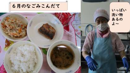 6月の和(なごみ)献立は、ごはん・牛乳・さわらの塩こうじあげ・切干大根の煮つけ・みょうがのみそ汁でした。塩こうじにつけたさわらは、身もふんわりやわらかく、「さわら、最高!おかわりジャンケン絶対勝つぞ!」とおいしく食べていました。切干大根のにつけはけずりぶしのだしの味がしみ込み、予定よりもたくさん出来上がったけれどしっかり食べていました。みょうがのみそ汁は、旬のみょうがのシャキシャキの食感やさわやかな味を楽しんで食べていました。