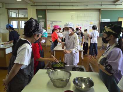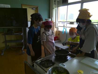家庭科「朝食から健康な一日を」の学習で、いためる調理をしました。今回は小松菜をいためました。いためる調理は2回目ということで、前回の実習で学んだことを生かして取り組むことができました。