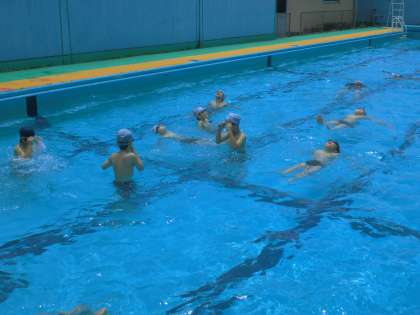 高学年も水泳学習が始まりました。体操をして体を洗ったら、プール全体を使って水慣れをして体の調子を確かめます。その後、背浮きの練習をして、水中で力を抜く感覚をつかみます。何度かやっていくうちに、水面に顔だけを出して息を続けることができる人が増えてきました。