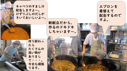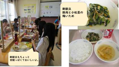 今日の献立は、ごはん・牛乳・豚肉と小松菜の梅いため・キャベツのすまし汁です。新献立の「豚肉と小松菜の梅いため」は、梅干しの、甘酸っぱさがほんのりきいていました。子どもたちも、梅干しと聞いて、酸っぱいと思って減らしたけど、食べてみたらおいしかったとおかわりをする子もたくさんいました。キャベツのすまし汁は、けずりぶしのだしがきいていました。お残しは全校で2人分くらいでした。