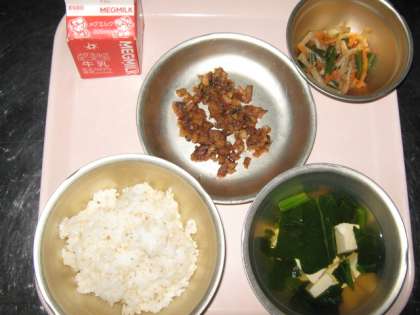 今日はセルフ丼です。献立は,「あなご丼・牛乳・野菜のきんぴら・すまし汁」です。『あなご丼』は教室で「あなご丼の具」を自分でごはんの上にのせていただきます。あなごの苦手な子たちもいますが,丼にしてしっかり食べていました。