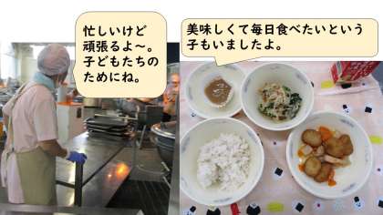 今日の献立は、麦ごはん・牛乳・平天とこんにゃくの煮つけ・切干大根の煮びたし・ういろうです。甘辛い味のしみ込んだ平天は人気があります。切干大根もけずりぶしのだしがしみ込んでおいしいです。ういろうは、「江戸時代から食べられてきた和菓子なんだ」「毎日でも食べたい」「もちもちしておいしかった」と感想を聞かせてくれました。給食調理員さんは、入念に打合せしながら、心を込めて手作りの「ういろう」をカップに盛り付けて、蒸して、大忙し。でも、残菜がほぼなく、「しっかり食べてくれて嬉しいわ」とおっしゃっていました。