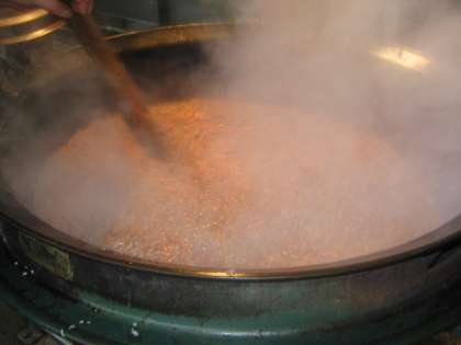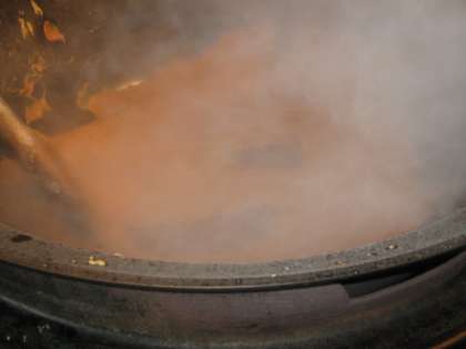 写真は,上から「ルーを作っているところ」「具を煮込んでいるところ」「きょうの給食」です。