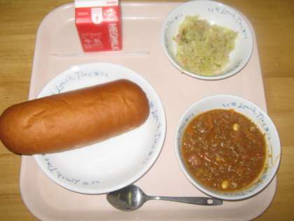 今日の給食は,『味付けコッペパン・牛乳・キーマカレー・ツナとキャベツのソティ』です。