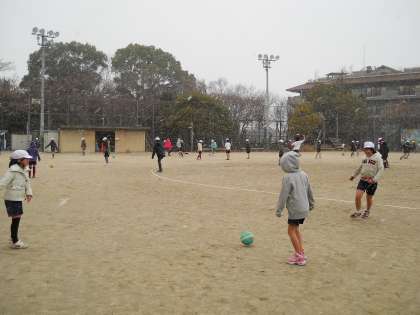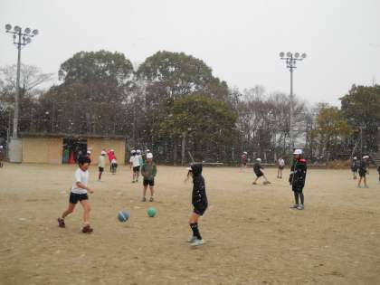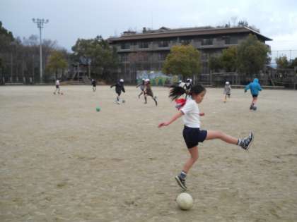 はじめは「寒い〜〜!」と凍えていた子どもたちも,パス練習やドリブル競争をしているうちにヒートアップ!!授業終了後は汗ばむくらい身体が温まりました☆