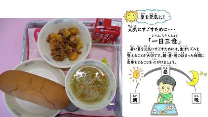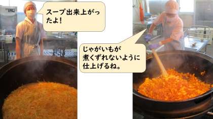 今日の献立は、味つけコッペパン・牛乳・豚肉のケチャップ煮・スープです。炒めた豚肉にケチャップ・ウスターソース・砂糖で味つけし、蒸したじゃがいもをからめて仕上げます。スープは、野菜たっぷりで「レシピが欲しいな」という子もいたほどです。給食調理員さんは、暑さでハアハア言いながら一生懸命作ってくださっていますよ。
