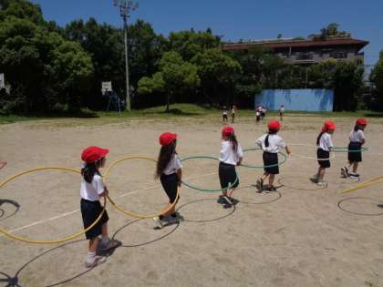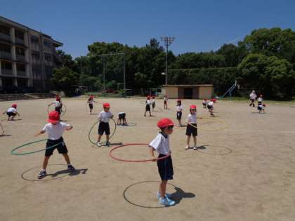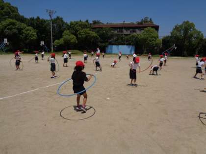 今日は、用具遊びとしてフラフープを使った遊びをしました。フラフープを縄跳びにしてみたり転がしてみたり全身を使って楽しみました。明日もようぐあそびをします。いろいろな用具を使って体を動かす遊びを楽しんでほしいです。