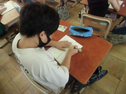 フェルトペンで書く前に今日は鉛筆で練習をしました。漢字と平仮名の文字の大きさに気を付けたり、文字を書く位置に気を付けたり、集中して取り組みました。次の時間の本番が楽しみになる授業でした。みんなでがんばろうね。