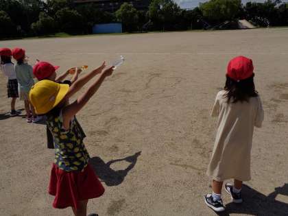 生活科の学習でみずあそびをしました。ケチャップやマヨネーズの空き容器を使った水鉄砲遊びでは、どれだけ遠くへ飛ばしたり地面に絵を描いたり思い思いの遊びをしていました。笑顔が弾けてとても楽しそうでした。