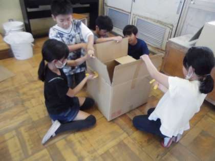 段ボールに切り込みを入れて、組み合わせることで友達と作品を作っています。「タワーを作る!」「家を作る!」など、友達と協力しながら取り組んでいます。