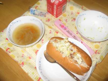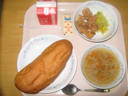 今日の給食は,『コッペパン・牛乳・チキンサンド・スープ』です。