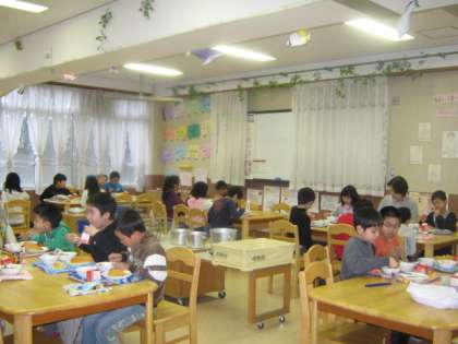 ランチルーム給食の時は,調理員さんも一緒にいただきます。子どもたちと楽しく食べながら,しっかり食べる子どもたちを見守ってくださっています。