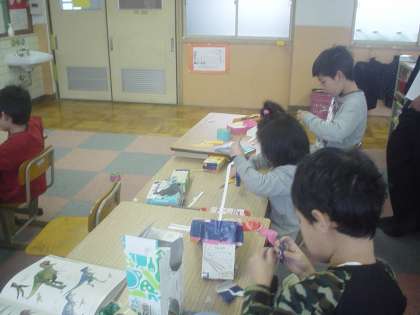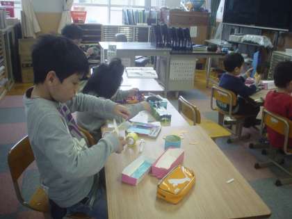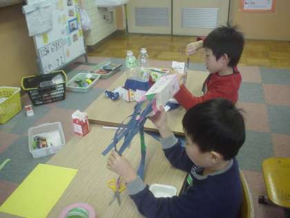 乗り物やおいしい食べもの,生き物などを,思い思いに作りました。みんながんばって作っていました。