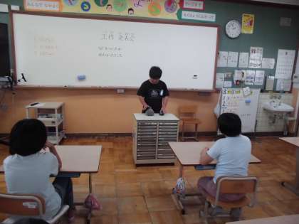 夏休みの間に子どもたちが作った作品を、学級で発表しました。