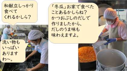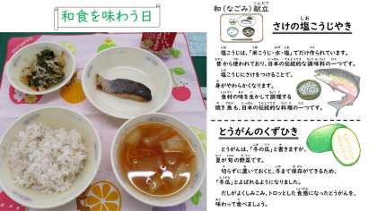 また、塩こうじにつけて、スチームコンベクションオーブンで焼いた鮭も「おいしい」と言って食べていました。けずりぶしのだしで炊いた小松菜と切干大根の煮びたしは、「シャキシャキしておいしい」「切干大根から、だしの香りがしました」と味わって食べられていました。