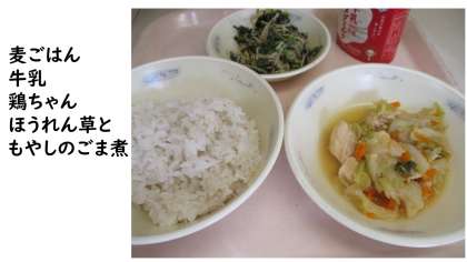 今日の献立は、麦ごはん・牛乳・鶏ちゃん・ほうれん草ともやしのごま煮です。新献立の鶏ちゃんは、料理酒と薄口しょうゆにつけた鶏肉と、野菜を甘辛いタレで炒めます。岐阜県の郷土料理です。鶏肉が貴重な食材だった頃は、大切なお客様や、親戚が集まるお正月などの特別な日の料理でした。