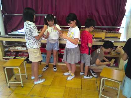 音の学習が始まりました。今日は音楽室に行って楽器を鳴らし、楽器が音を出す時に震えていることに気付いていました。