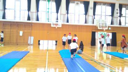 体育の学習では、「マット運動」に取り組んでいます。できる技を組み合わせて回ったり、もう少し頑張ればできそうな技に挑戦したりしています。気を付けるポイントを自分で考え、それを意識して技の完成をめざしています。