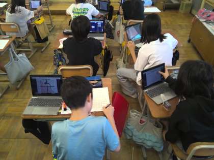 5年生の算数の学習で、面積の単元に入りました。長方形や正方形の面積の求め方を使って、直角三角形や三角形の面積を求めていきます。タブレットを使って面積を求められるように図形を変形させ、友だちにどう考えたかを説明し合いました。