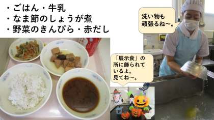 ごはん・牛乳・なま節のしょうが煮・野菜のきんぴら・赤だしです。なま節は、スチームコンベクションオーブンで炊きました。野菜のきんぴらには、けずり粉を使ってごまの風味と一緒に味わいました。赤だしは、けずりぶしのだしで八丁みそのコクが楽しめます。