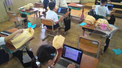 紙袋をくしゃくしゃにして新聞紙をつめることで可愛い作品を作っています。オリジナルの生き物がたくさんできており、完成したら持って帰るのでまた見てみてください。