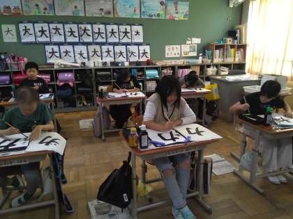 毛筆の学習で「力」という字を書きました。「おれ」と「はね」に気を付けて書きました。