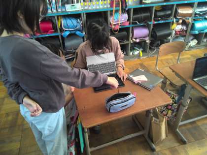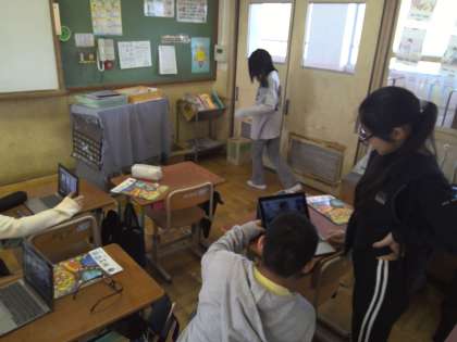 図画工作科の学習で、コマ撮りで作品作りをしました。人が動いたり、ものを動かしたりして写真を複数枚撮影し、組み合わせて動きを表現します。完成をイメージしながら楽しんで作品作りに取り組みました。