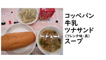 今日の献立は、コッペパン・牛乳・ツナサンド(フレンチ味)(具)・スープです。