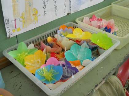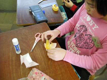 折り紙の花びらに,タフロープを細かく刻んだおしべをつけて完成!