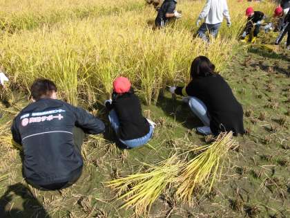 25日(水)地域の方の協力のもと育てていただいた田んぼで稲刈り体験を行いました。まずは鎌の使い方を教えていただき、手分けして作業をしていきました。