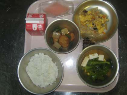 ひな祭りは,子どもたちが健康に過ごせますようにと願う行事です。給食では,『ちらしずし・きざみのり・牛乳・平天の煮つけ・菜の花のすまし汁・三色ゼリー』の献立です。